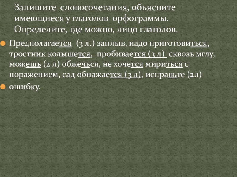 Запишите словосочетания, объясните имеющиеся у глаголов орфограммы. Определите, где можно, лицо глаголов.