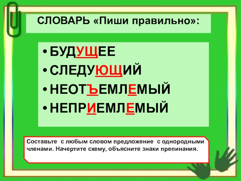 СЛОВАРЬ «Пиши правильно»: БУДУЩЕЕСЛЕДУЮЩИЙНЕОТЪЕМЛЕМЫЙНЕПРИЕМЛЕМЫЙСоставьте с любым словом предложение с однородными членами. Начертите схему, объясните знаки препинания.