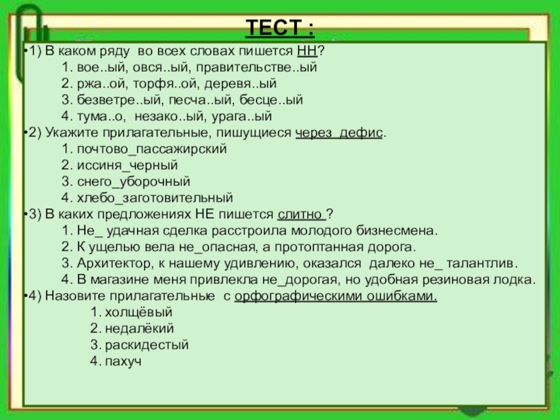 ТЕСТ :1) В каком ряду во всех словах пишется НН?1. вое..ый, овся..ый, правительстве..ый2. ржа..ой, торфя..ой, деревя..ый3. безветре..ый,