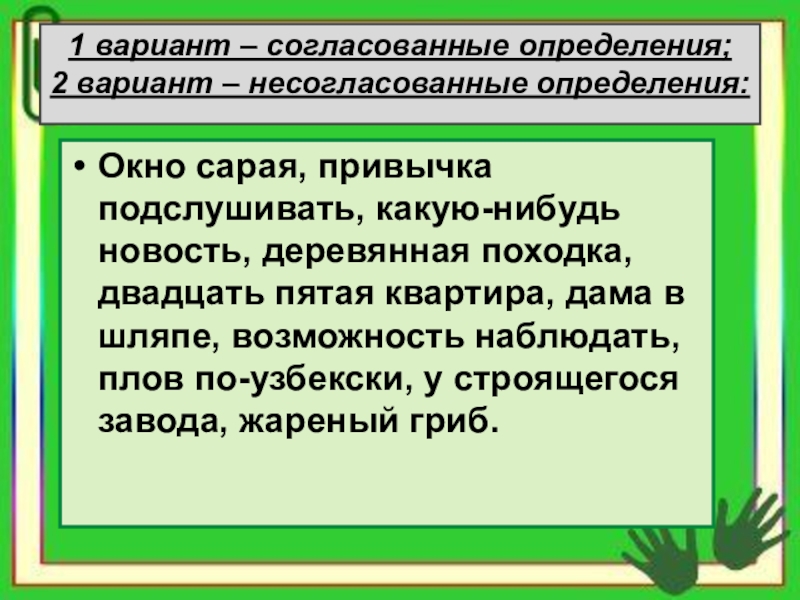1 вариант – согласованные определения;  2 вариант – несогласованные определения:  Окно сарая, привычка подслушивать,