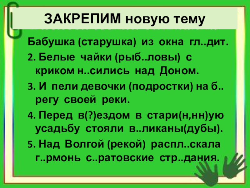 ЗАКРЕПИМ новую тему Бабушка (старушка) из окна гл..дит.2. Белые чайки (рыб..ловы) с криком н..сились над Доном.3. И