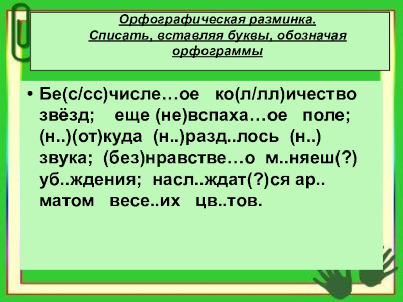 Орфографическая разминка. Списать, вставляя буквы, обозначая орфограммы Бе(с/сс)числе…ое  ко(л/лл)ичество звёзд;  еще (не)вспаха…ое  поле;