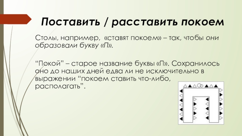 “Покой” – старое название буквы «П». Сохранилось оно до наших дней едва ли не исключительно в выражении “покоем ставить что-либо, располагать”.