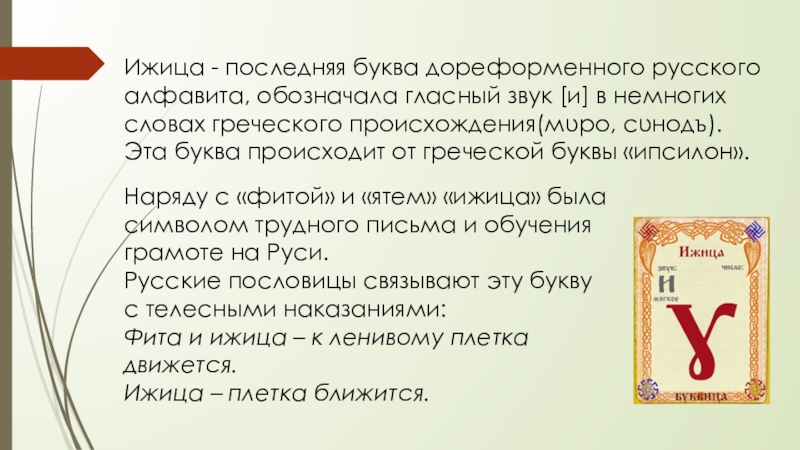 Слайд 29Ижица - последняя буква дореформенного русского алфавита, обозначала гласный звук [и]