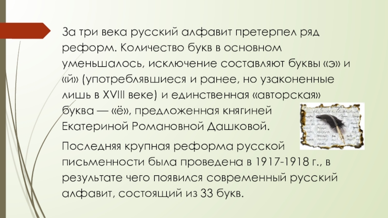 Слайд 7За три века русский алфавит претерпел ряд реформ. Количество букв в