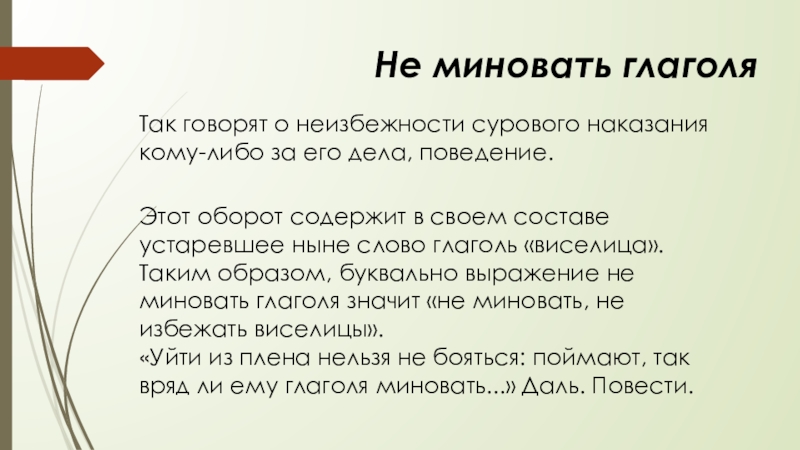 Этот оборот содержит в своем составе устаревшее ныне слово глаголь «виселица». Таким образом, буквально выражение не миновать глаголя значит «не миновать, не избежать виселицы».