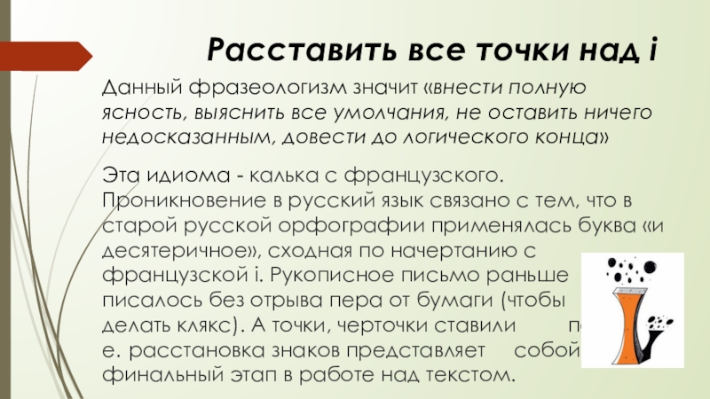Эта идиома - калька с французского. Проникновение в русский язык связано с тем, что в старой русской орфографии применялась буква «и десятеричное», сходная по начертанию с французской i. Рукописное письмо раньше писалось без отрыва пера от бумаги (чтобы не делать клякс). А точки, черточки ставили после, т.е. расстановка знаков представляет собой финальный этап в работе над текстом.