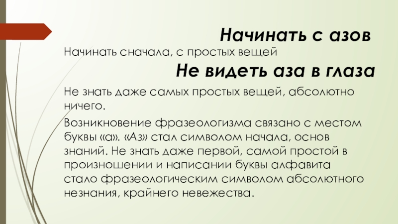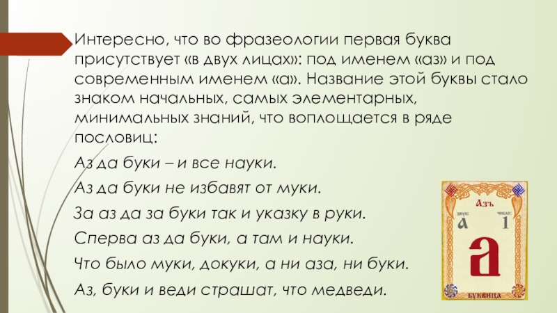 именем «аз» и под современным именем «а». Название этой буквы стало знаком начальных, самых элементарных, минимальных знаний, что воплощается в ряде пословиц: