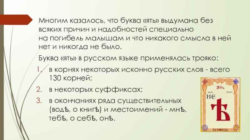 Слайд 25Многим казалось, что буква «ять» выдумана без всяких причин и надобностей специально на погибель