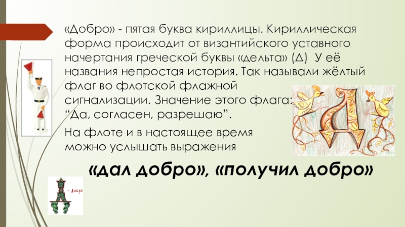 Слайд 17«Добро» - пятая буква кириллицы. Кириллическая форма происходит от византийского уставного