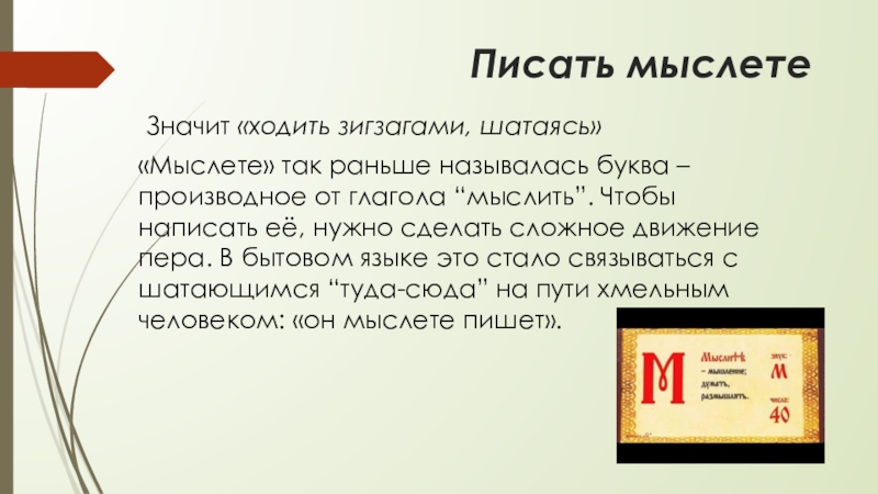– производное от глагола “мыслить”. Чтобы написать её, нужно сделать сложное движение пера. В бытовом языке это стало связываться с шатающимся “туда-сюда” на пути хмельным человеком: «он мыслете пишет».