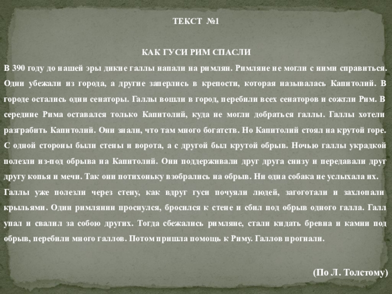 галлы напали на римлян. Римляне не могли с ними справиться. Одни убежали из города, а другие заперлись в крепости, которая называлась Капитолий. В городе остались одни сенаторы. Галлы вошли в город, перебили всех сенаторов и сожгли Рим. В середине Рима оставался только Капитолий, куда не могли добраться галлы. Галлы хотели разграбить Капитолий. Они знали, что там много богатств. Но Капитолий стоял на крутой горе. С одной стороны были стены и ворота, а с другой был крутой обрыв. Ночью галлы украдкой полезли из-под обрыва на Капитолий. Они поддерживали друг друга снизу и передавали друг другу копья и мечи. Так они потихоньку взобрались на обрыв. Ни одна собака не услыхала их.
