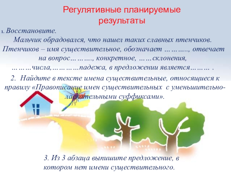 Птенчиков – имя существительное, обозначает ……….., отвечает на вопрос………., конкретное, ……склонения, ………числа,…………падежа, в предложении является……… .