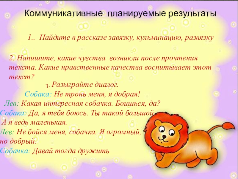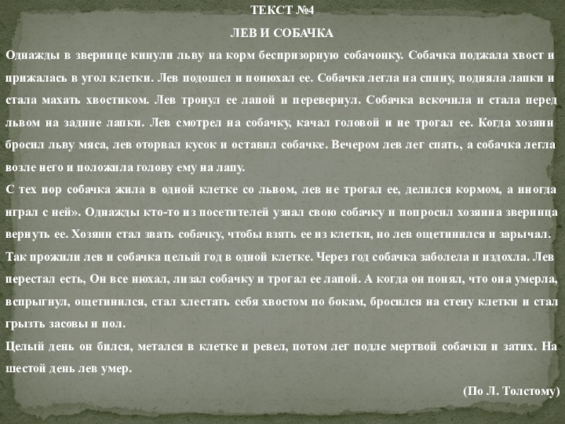 собачонку. Собачка поджала хвост и прижалась в угол клетки. Лев подошел и понюхал ее. Собачка легла на спину, подняла лапки и стала махать хвостиком. Лев тронул ее лапой и перевернул. Собачка вскочила и стала перед львом на задние лапки. Лев смотрел на собачку, качал головой и не трогал ее. Когда хозяин бросил льву мяса, лев оторвал кусок и оставил собачке. Вечером лев лег спать, а собачка легла возле него и положила голову ему на лапу.