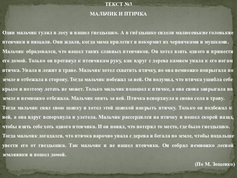 Мальчик обрадовался, что нашел таких славных птенчиков. Он хотел взять одного и принести его домой. Только он протянул к птенчикам руку, как вдруг с дерева камнем упала к его ногам птичка. Упала и лежит в траве. Мальчик хотел схватить птичку, но она немножко попрыгала по земле и отбежала в сторону. Тогда мальчик побежал за ней. Он подумал, что птичка ушибла себе крыло и поэтому летать не может. Только мальчик подошел к птичке, а она снова запрыгала по земле и немножко отбежала. Мальчик опять за ней. Птичка вспорхнула и снова села в траву.