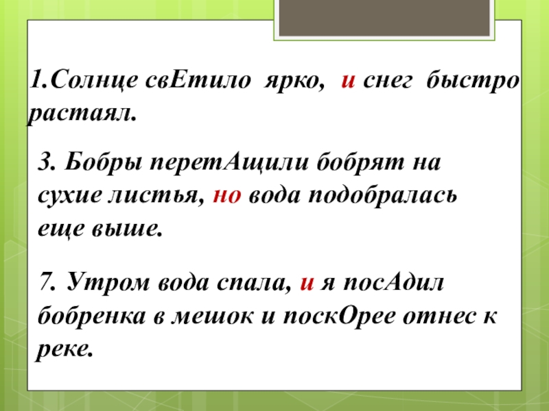 7. Утром вода спала, и я посАдил бобренка в мешок и поскОрее отнес к реке.