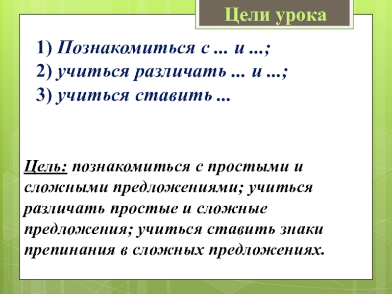 Цель: познакомиться с простыми и сложными предложениями; учиться различать простые и сложные предложения; учиться ставить знаки препинания в сложных предложениях.