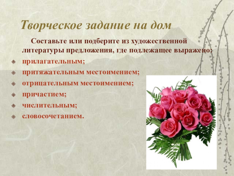 Творческое задание на дом     Составьте или подберите из художественной литературы предложения, где подлежащее