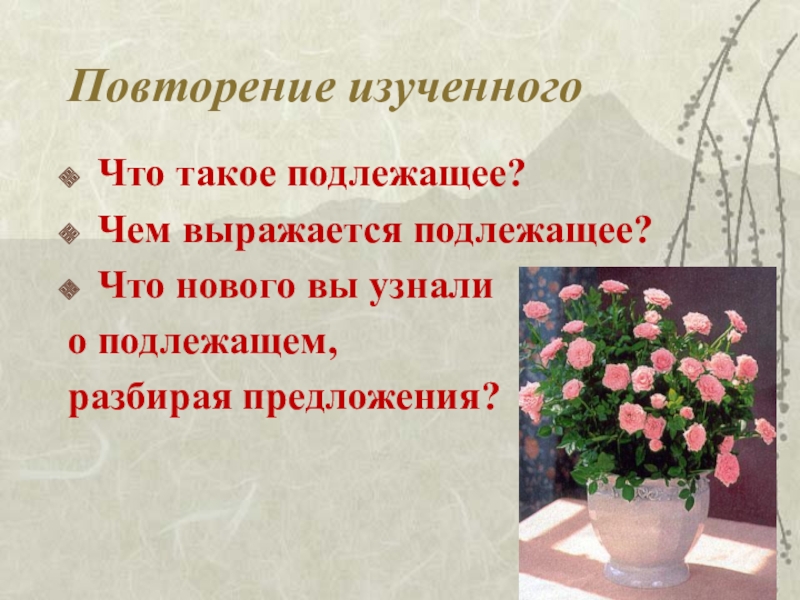 Повторение изученногоЧто такое подлежащее?Чем выражается подлежащее?Что нового вы узнали о подлежащем, разбирая предложения?