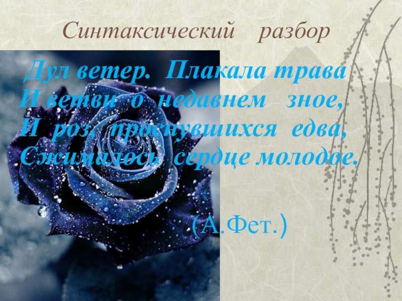Синтаксический  разбор  Дул ветер. Плакала трава И ветви о недавнем  зное, И роз, проснувшихся
