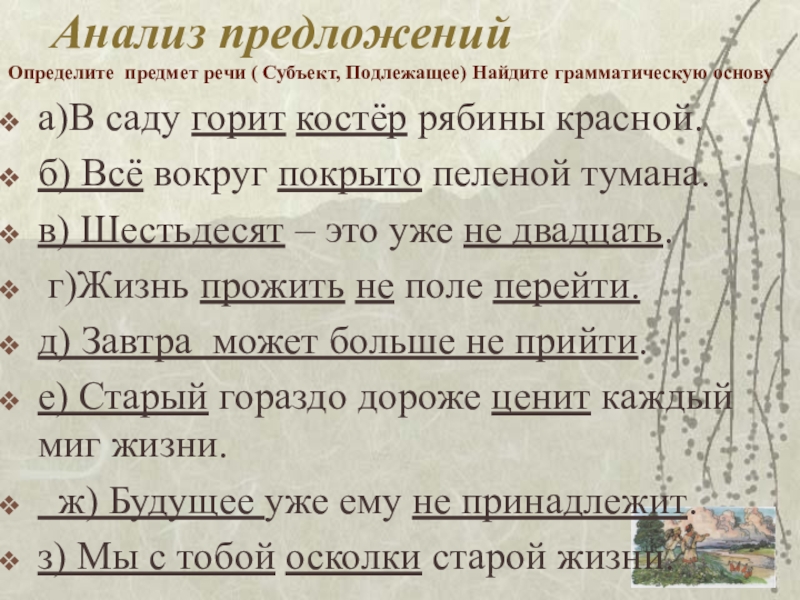 Анализ предложенийОпределите предмет речи ( Субъект, Подлежащее) Найдите грамматическую основуа)В саду горит костёр рябины красной.б) Всё вокруг