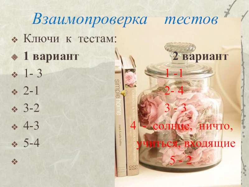Взаимопроверка  тестовКлючи к тестам:1 вариант