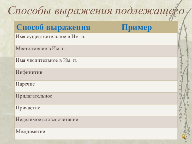 Слайд 1  Подлежащее Способы выражения подлежащего