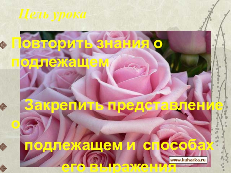 Цель урока Повторить знания о подлежащем  Закрепить представление о    подлежащем и способах