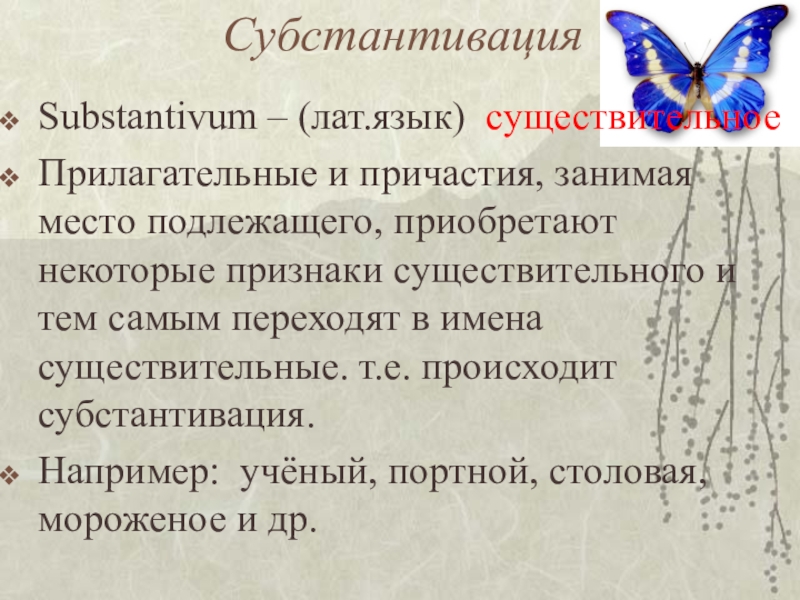 Субстантивация Substantivum – (лат.язык) существительноеПрилагательные и причастия, занимая место подлежащего, приобретают некоторые признаки существительного и тем самым