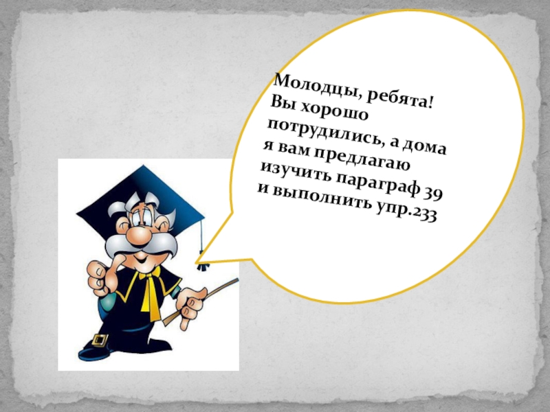 Молодцы, ребята! Вы хорошо потрудились, а дома я вам предлагаю изучить параграф 39 и выполнить упр.233