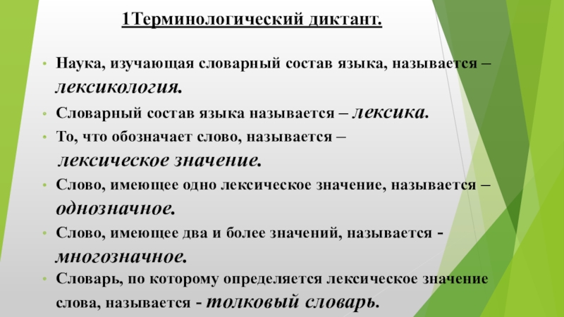 1Терминологический диктант. Наука, изучающая словарный состав языка, называется – лексикология.Словарный состав языка называется – лексика.То, что обозначает