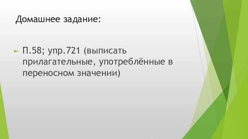Домашнее задание:П.58; упр.721 (выписать прилагательные, употреблённые в переносном значении)