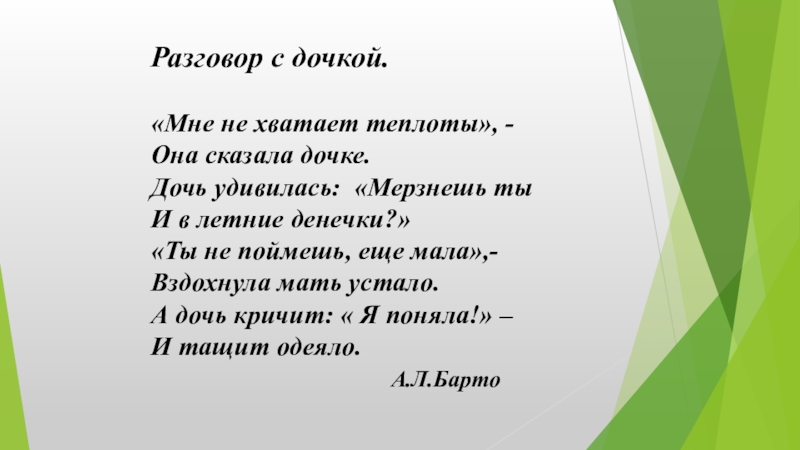 Разговор с дочкой.«Мне не хватает теплоты», -Она сказала дочке.Дочь удивилась: «Мерзнешь тыИ в летние денечки?»«Ты не поймешь,