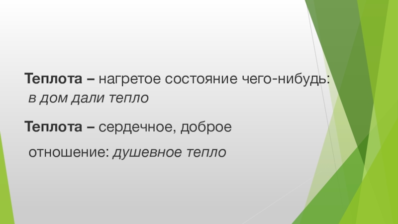 Теплота – нагретое состояние чего-нибудь: в дом дали теплоТеплота – сердечное, доброе отношение: душевное тепло