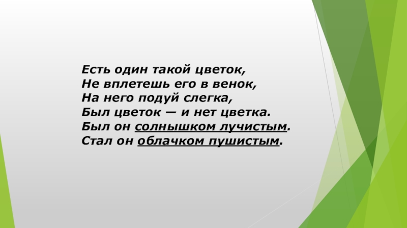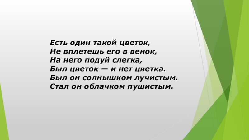 Есть один такой цветок, Не вплетешь его в венок, На него подуй слегка, Был цветок — и