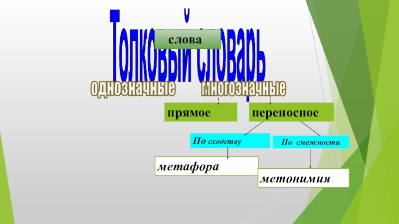Толковый словарь    переносноеметафораметонимия   словаоднозначныемногозначныепрямоеПо сходству  По смежности