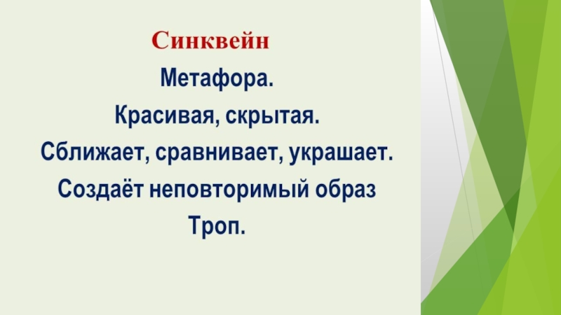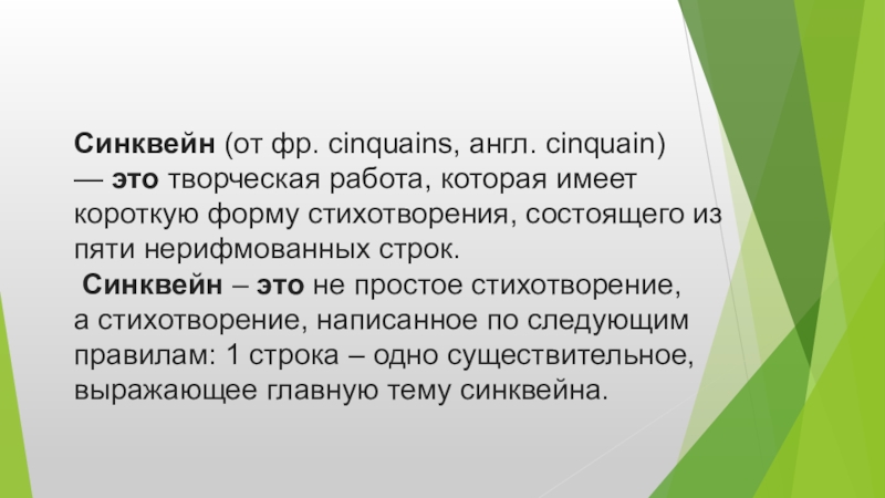 Слайд 20Синквейн (от фр. cinquains, англ. cinquain) — это творческая работа, которая имеет короткую форму
