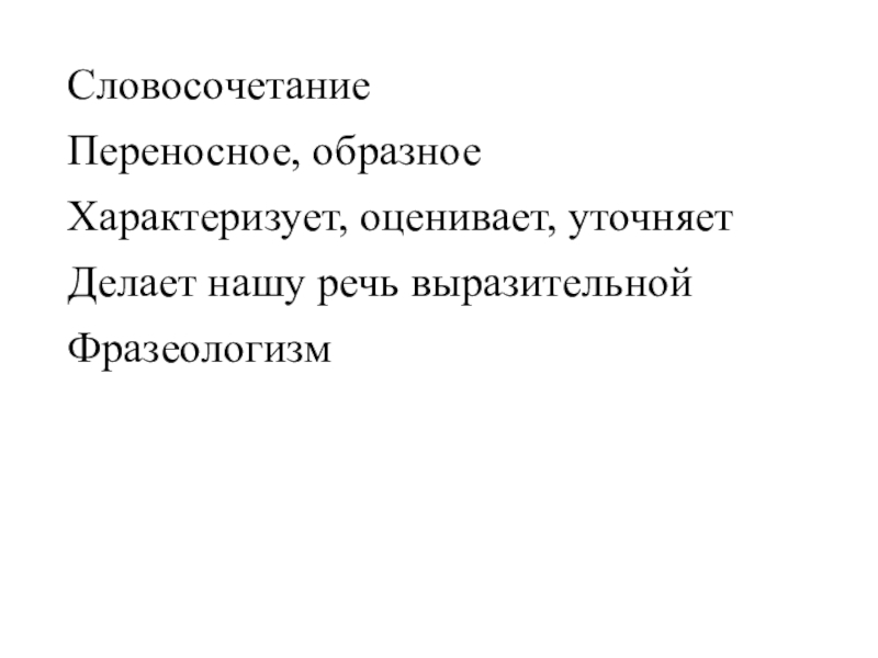 СловосочетаниеПереносное, образноеХарактеризует, оценивает, уточняетДелает нашу речь выразительнойФразеологизм