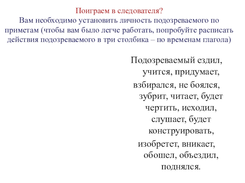 взбирался, не боялся, зубрит, читает, будет чертить, исходил, слушает, будет конструировать,