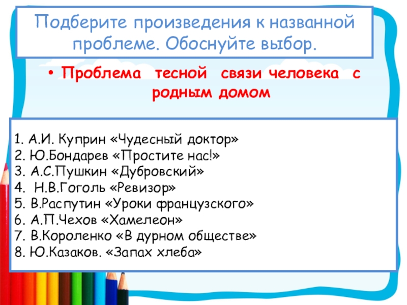 Подберите произведения к названной проблеме. Обоснуйте выбор.