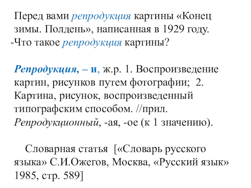 Репродукция, – и, ж.р. 1. Воспроизведение картин, рисунков путем фотографии; 2. Картина, рисунок, воспроизведенный типографским способом. //прил. Репродукционный, -ая, -ое (к 1 значению).