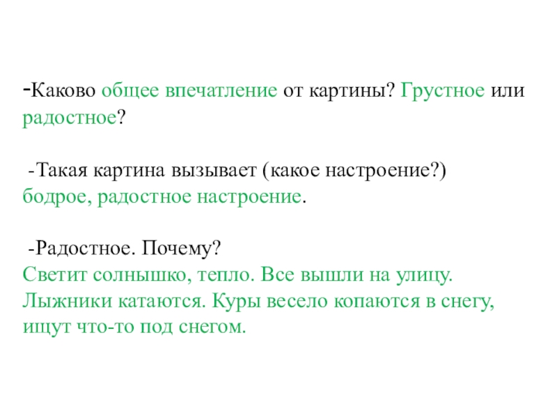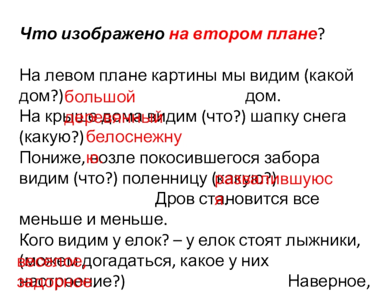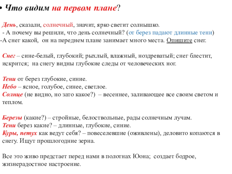 В центре картины (какие?) куры выискивают зернышки в (каком?) снегу. Справа красуются (какие?) ели. Слева (какой?) дом, с его крыши сползает (какая?) шапка снега. Но более всего на переднем плане картины нас привлекает (какой?) снег. Художник специально сел против солнца, чтобы лучше показать красоту снега в (какой?) день. Здесь, на картине, снег как бы впитал в себя все краски неба и отсвечивает (какими?) оттенками.