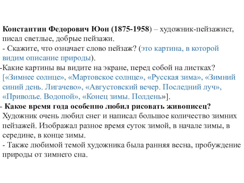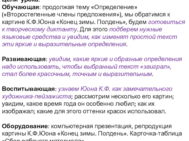 Воспитывающая: узнаем Юона К.Ф. как замечательного художника-пейзажиста; рассмотрим несколько его картин; увидим, какое время года он особенно любил; как их изображал; какие для этого оттенки красок использовал.