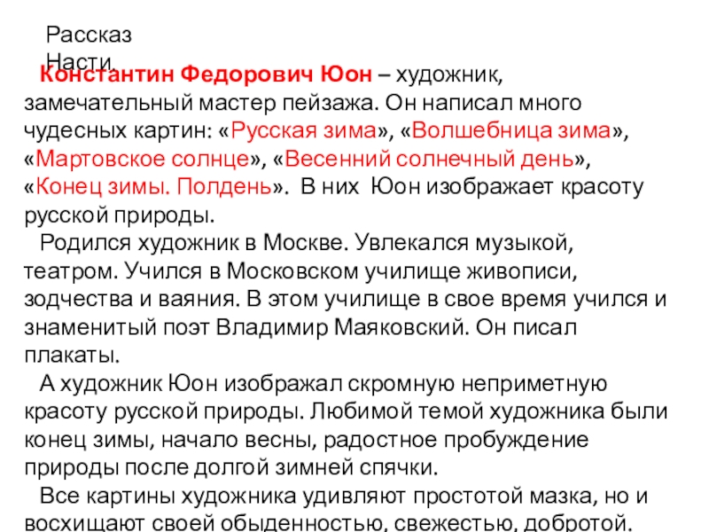 написал много чудесных картин: «Русская зима», «Волшебница зима», «Мартовское солнце», «Весенний солнечный день», «Конец зимы. Полдень». В них Юон изображает красоту русской природы.