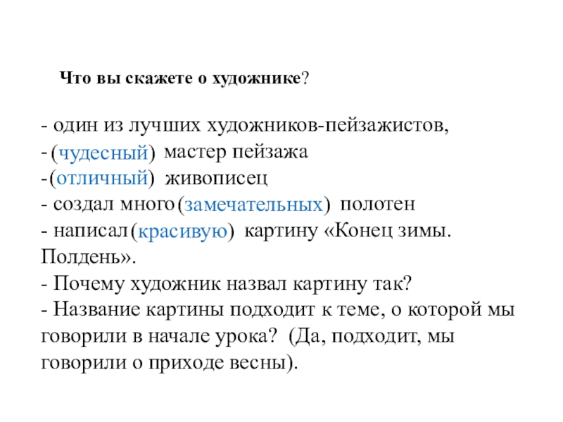 картин о русской природе. Больше всего он любил изображать пробуждение природы (в какое время года?) весной. Наступлению весны он посвятил картину (какую?) «Конец зимы. Полдень».