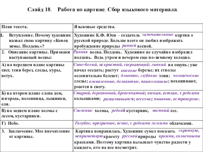Оборудование: компьютерная презентация, репродукция картины К.Ф.Юона «Конец зимы. Полдень». Карточка-таблица «Сбор рабочего материала».