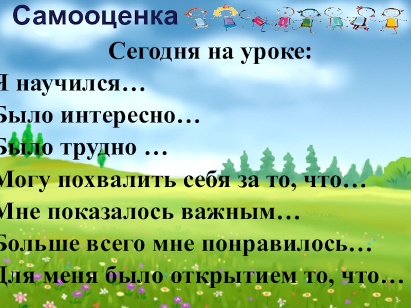 Самооценка    Сегодня на уроке:Я научился…Было интересно…Было трудно …Могу похвалить себя за то, что…Мне показалось