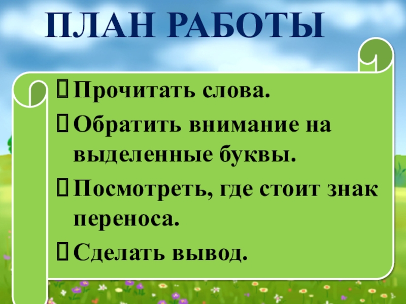 Прочитать слова.Обратить внимание на выделенные буквы.Посмотреть, где стоит знак переноса.Сделать вывод.ПЛАН РАБОТЫ