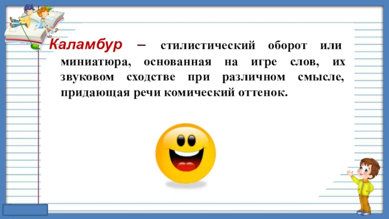 Слайд 15Каламбур – стилистический оборот или миниатюра, основанная на игре слов, их