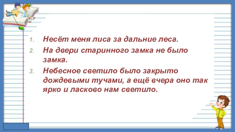Несёт меня лиса за дальние леса.На двери старинного замка не было замка.Небесное светило было закрыто дождевыми тучами,
